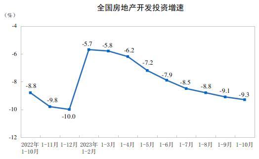 1—10月份,全國房地產(chǎn)開發(fā)投資95922億元,同比下降9.3%(按可比口徑計(jì)算,詳見附注6);其中,住宅投資72799億元,下降8.8%。