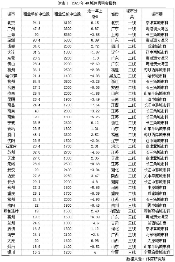 從漲跌結(jié)構(gòu)看,緯房研究院數(shù)據(jù)顯示,2023年重點(diǎn)40城中有15個城市住房租金同比上漲,其余25個城市住房租金同比下降。住房租金上漲的城市中,7個城市漲幅在2%以內(nèi),8個城市漲幅超過2%;住房租金下跌的城市中,8個城市跌幅在2%以內(nèi),9個城市跌幅在2-4%;8個城市跌幅超過4%。