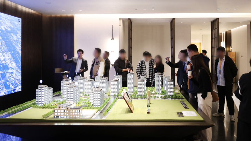 (北京房山區(qū)華潤(rùn)京熙潤(rùn)府售樓處沙盤前看房人群絡(luò)繹不絕)