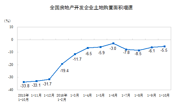 1-10月份,房地產(chǎn)開發(fā)企業(yè)土地購(gòu)置面積16873萬(wàn)平方米,同比下降5.5%,降幅比1-9月份收窄0.6個(gè)百分點(diǎn);土地成交價(jià)款6764億元,增長(zhǎng)16.7%,增速提高3.4個(gè)百分點(diǎn)。
