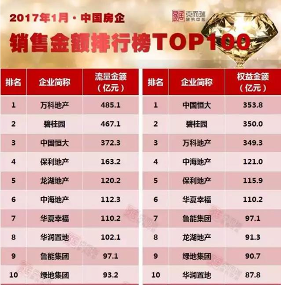 2017年1月中國(guó)房前銷售金額排行榜前十(來(lái)源:克而瑞研究中心)