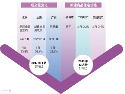 國家統(tǒng)計局70個大中城市住宅銷售價格統(tǒng)計數(shù)據(jù)顯示,2016年12月份有46座城市新建商品住宅價格環(huán)比上漲,2016年11月份為55座城市上漲,價格環(huán)比上漲的城市個數(shù)在減少。其中一線城市新建商品住宅價格環(huán)比由上月的上漲0.1%轉(zhuǎn)為持平;二線城市新建商品住宅價格上漲0.2%,比上月回落0.2個百分點;三線城市新建商品住宅價格上漲0.4%,比上月回落0.4個百分點。15個一線和熱點二線城市因地制宜、因城施策實施調(diào)控政策以來,政策效果明顯,房價快速趨穩(wěn)回落。其中廣州市已連續(xù)三個月環(huán)比漲幅回落。