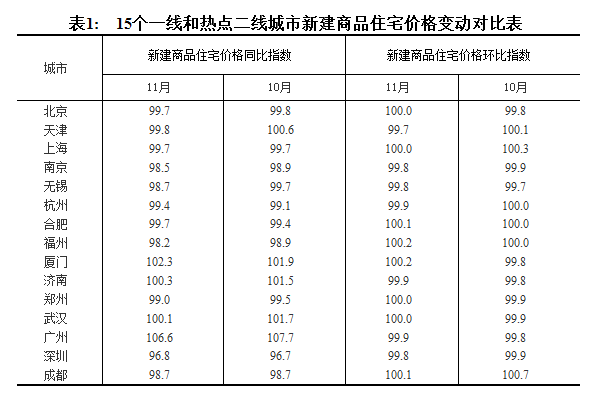 11月份,70個大中城市中15個熱點城市房地產市場總體繼續(xù)保持平穩(wěn)。從環(huán)比看,7個城市新建商品住宅價格下降,降幅在0.1%至0.3%之間;北京、上海、鄭州和武漢4個城市環(huán)比持平。