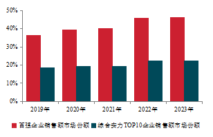 報(bào)告顯示,2023年,百強(qiáng)企業(yè)銷售總額、銷售面積分別達(dá)53896.0億元、26131.6萬平方米。 百強(qiáng)企業(yè)市場份額為46.2%,較上年微增0.4個(gè)百分點(diǎn)。