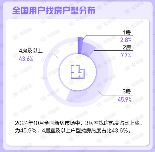 在用戶找房戶型方面,3居室仍為現(xiàn)階段熱度較高的戶型,找房熱度占比上漲,為45.9%,4居室及以上戶型找房熱度占比43.6%。張波分析稱,改善潛在需求入場的趨勢表現(xiàn)明顯,10月全國購房群體中三、四房的需求占比持續(xù)提升,二手房交易稅費(fèi)的減免加之利率下行,是推動改善需求積極入市的組合性政策效果表現(xiàn)。