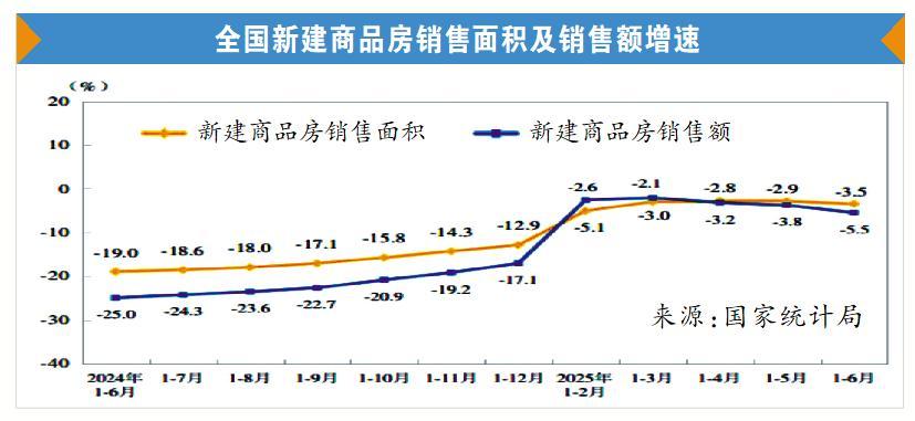 根據(jù)國家統(tǒng)計(jì)局發(fā)布的2025年上半年全國房地產(chǎn)市場基本情況,上半年,新建商品房銷售面積45851萬平方米,同比下降3.5%;其中住宅銷售面積下降3.7%。新建商品房銷售額44241億元,下降5.5%;其中住宅銷售額下降5.2%。6月末,商品房待售面積76948萬平方米,比5月末減少479萬平方米。其中,住宅待售面積減少443萬平方米。