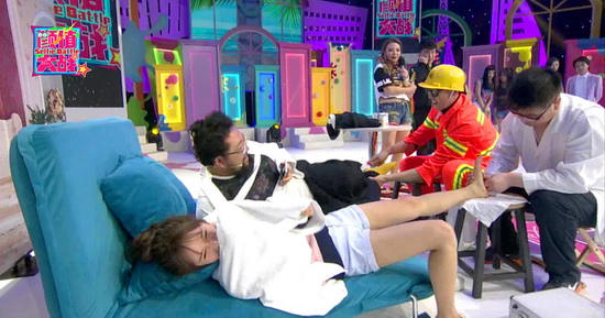 更悲慘的還在后面等著修睿。原地做造型自拍都困難無比,身子完全掌握不到平衡,直接踹翻道具椅,颶風(fēng)碉堡更是變成一座阻擋他前進(jìn)的大山,一步兩步往前跳,努力自拍擺造型,無奈實(shí)在抵擋不住勁風(fēng),直接單膝跪地整個人撲倒。和美女體驗情景自拍,抽到“撲倒與被撲倒”,被搭檔嫌棄還要忍受撓腳心的煎熬,拍出驚悚照被張大大、小甜甜一陣暴風(fēng)吐槽。而喬杉則和一貫的老搭檔小甜甜再度演繹情景,兩人同吃小香腸自拍,一邊喬杉被撓腳心哭笑不得,氣得搶下按摩器直敲“按摩師”。