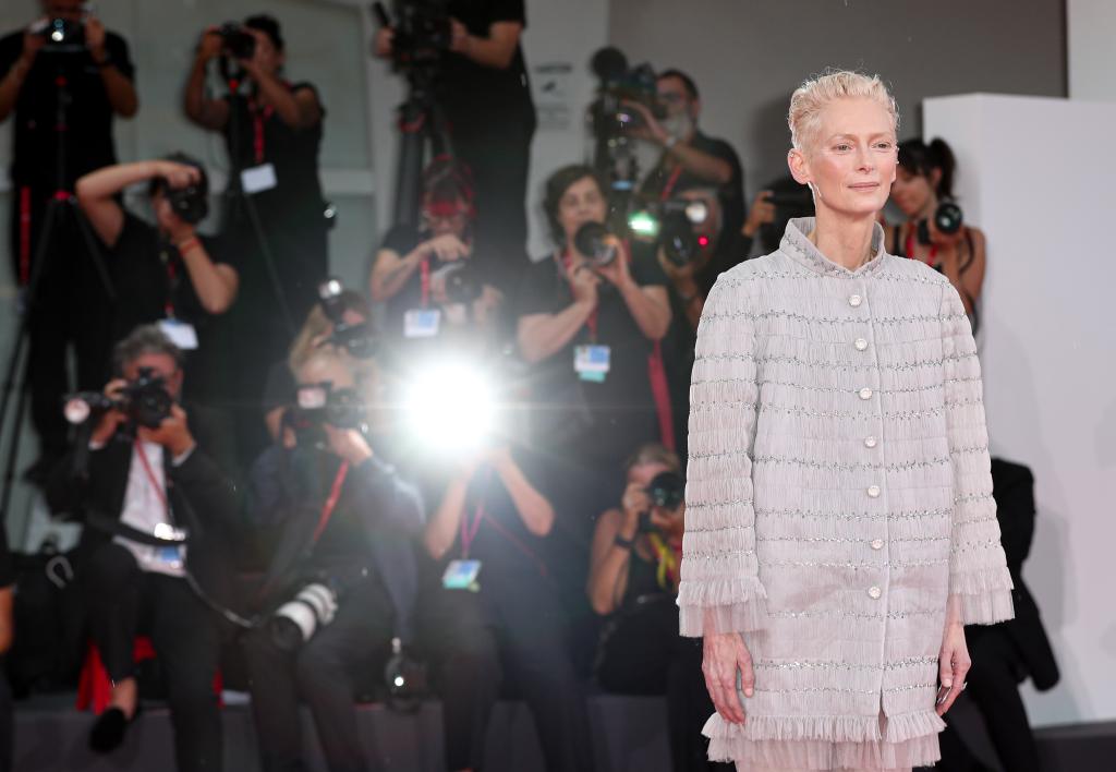 9月2日,在意大利威尼斯舉行的第81屆威尼斯國際電影節(jié)上,主競賽單元影片《隔壁房間》演員蒂爾達·斯文頓亮相首映式紅毯。新華社記者 李京 攝