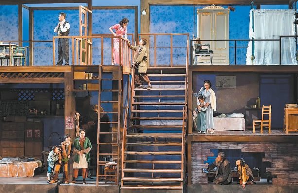 生動樸實的階層群像,是《烏鴉與麻雀》的一大看點,話劇對他們的塑造不限于軋金子、打麻將、搶盤尼西林等細膩熱絡(luò)的日常生活,也在舞臺空間中埋下種種暗喻,比如,公寓的布局設(shè)計耐人尋味,這是黃盈從電影中延續(xù)下來的靈感,高居頂樓的“烏鴉”、“雙腳離地”的知識分子、撐起社會基石的普通市民……房間的位置正是當時社會現(xiàn)實的寫照,在舞臺藝術(shù)中,階層間的壁壘與對比被格外立體地展現(xiàn)出來。