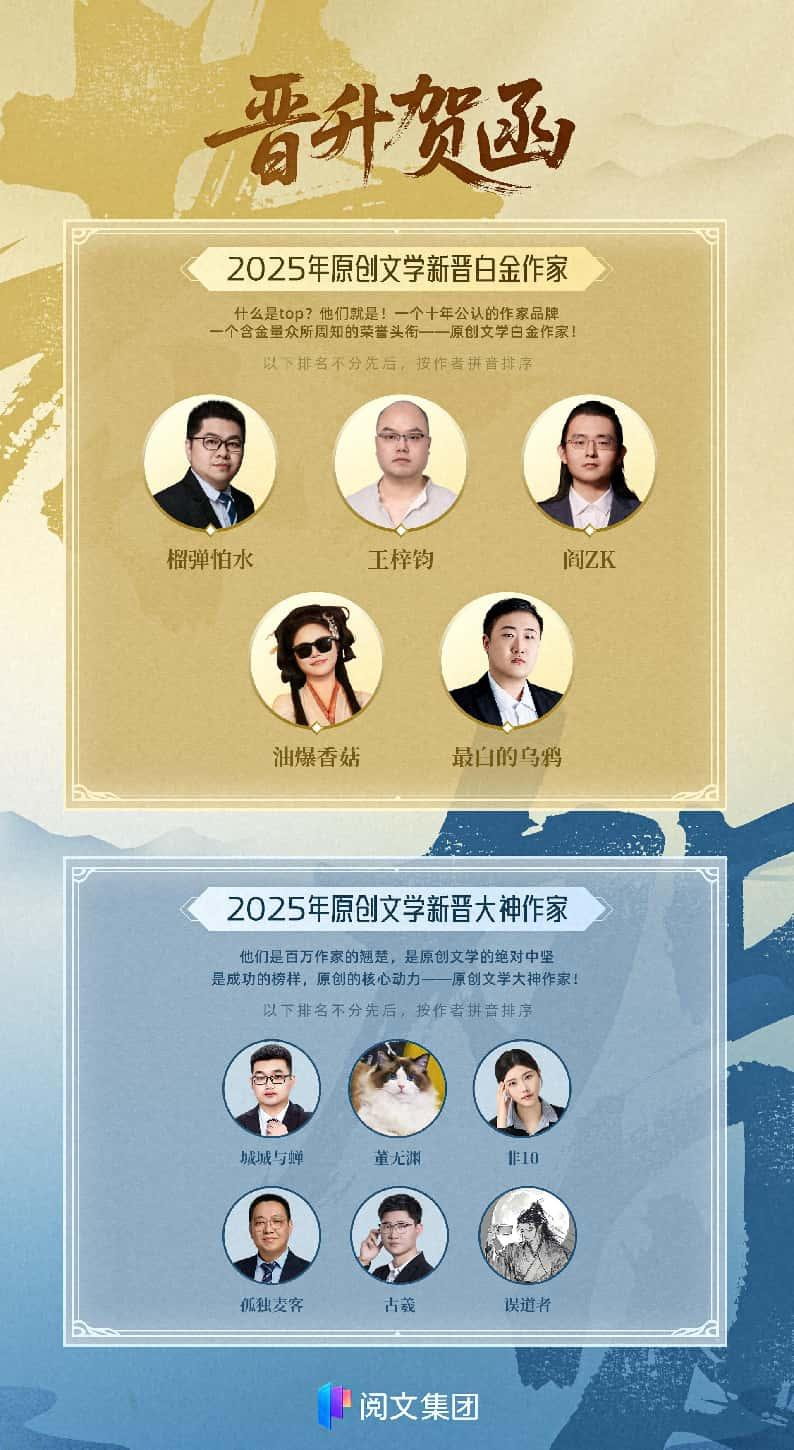 7月15日,閱文集團(tuán)發(fā)布2025年度“白金大神”作家名單,榴彈怕水、王梓鈞、閻ZK、油爆香菇、最白的烏鴉5名作者獲“白金作家”稱號,城城與蟬、董無淵、非10、孤獨麥客、古羲、誤道者6名作者獲“大神作家”稱號。
