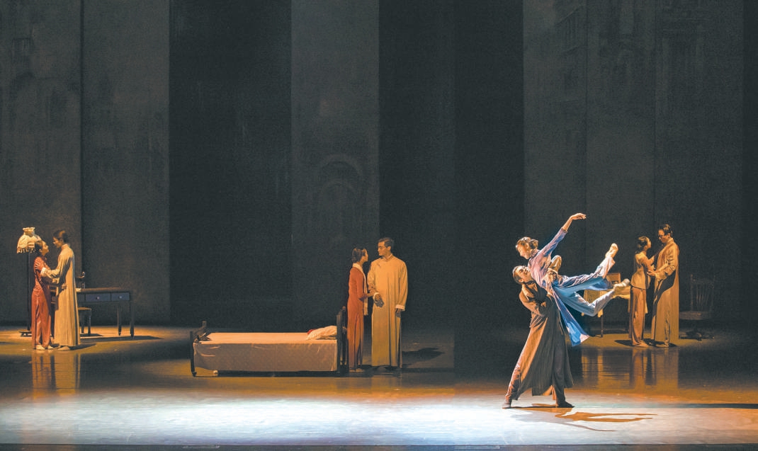 《永不消逝的電波》是韓真、周莉亞這對“舞壇雙子星”較早“出圈”的舞劇,在觀眾心中留下了很多經(jīng)典舞段。十余位身穿旗袍、手持蒲扇的女舞者,在《漁光曲》的旋律中曼妙起舞,浸透老上海風(fēng)情;與之產(chǎn)生強(qiáng)烈對比的是,披著黑色斗篷的特務(wù)在冷雨夜展開驚心動(dòng)魄的追捕;李俠與蘭芬從假扮夫妻到發(fā)展為真正的愛人,幾對舞者的雙人舞同臺(tái)綻放。這些片段時(shí)常在舞蹈愛好者腦海中盤旋。