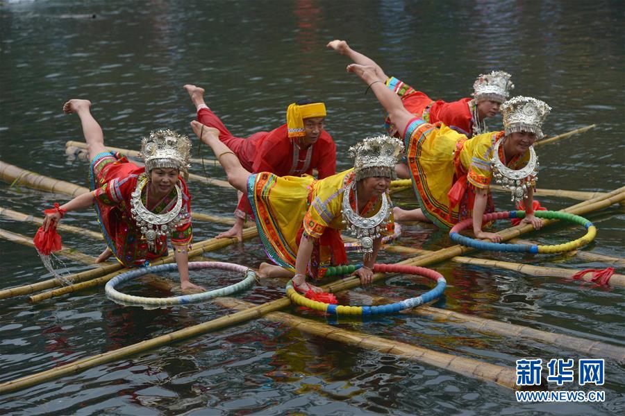 1月1日,“獨(dú)竹漂”愛好者在花溪河上表演水上高難度平衡動作。 2016年元旦,在貴陽市花溪公園平橋河段舉行的貴陽市第31屆冬泳表演活動中,數(shù)十名“獨(dú)竹漂”愛好者在花溪河上腳踏漂浮的竹竿,表演“金雞獨(dú)立”、轉(zhuǎn)身平衡等高難度動作,讓觀眾大飽眼福。新華社發(fā)(秦剛 攝)