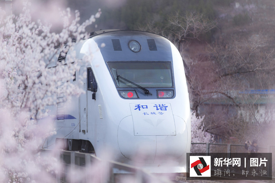 2016年3月23日,中國北京,又到一年花開時,數(shù)京城最美的鐵路景色還看京張鐵路居庸關(guān)。漫山遍野的桃花盛開,S2雪白的列車穿行其中,美不勝收。圖片來源:東方IC