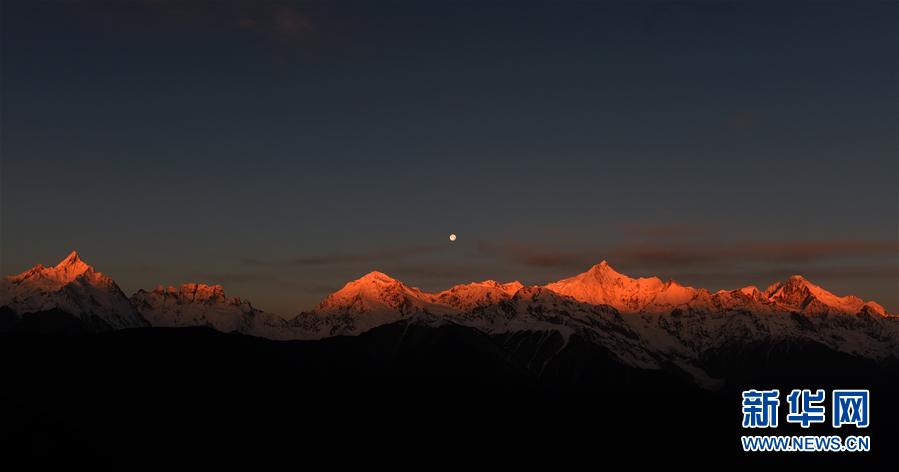 這是3月25日清晨拍攝的梅里雪山“日月同輝”景觀。梅里雪山位于滇藏交界的云南省迪慶藏族自治州德欽縣境內(nèi),是世界自然遺產(chǎn)“三江并流”的主要自然景觀之一。梅里雪山常年云霧籠罩,太陽光只在少數(shù)天晴的清晨照射在雪山頂上,形成絕美的“日照金山”美景。有時月亮尚未落山,太陽已經(jīng)升起,更是形成了難得一見的梅里雪山“日月同輝”奇觀。新華社記者 王長山 攝