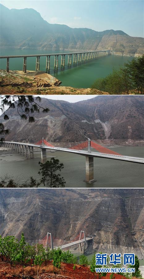 雅西高速瀑布溝庫區(qū)路段3座跨大渡河特大橋:青杠嘴特大橋(上圖)、觀音巖特大橋(中圖)、蘇村壩特大橋(下圖,拼版照片,攝于2012年4月12日)。1935年5月24日、25日間,紅軍“十七勇士”在槍林彈雨中,以一條木船強行從安順場渡河,在國民黨軍視為天險的大渡河防線上,撕開了一個缺口,為紅軍沿大渡河兩岸夾河北上奪占瀘定橋創(chuàng)造了有利條件。 “紅軍不怕遠征難,萬水千山只等閑?!遍L征譜寫了一曲人類征服自然的凱歌,峽谷激流、雪山草地、物資匱乏、生命禁區(qū),這一切都不能阻擋紅軍前進的步伐。80年過去,滄海桑田,紅軍長征走過的荒郊野嶺,如今樓宇林立,欣欣向榮;徒步翻越的大山、攻克的關(guān)隘、沼澤遍布的草地、泅渡的河流,修起了通暢快捷的公路和大橋……長征之路發(fā)生了翻天覆地的變化,昔日的艱難險阻正漸漸變成康莊通途。新華社記者江宏景攝