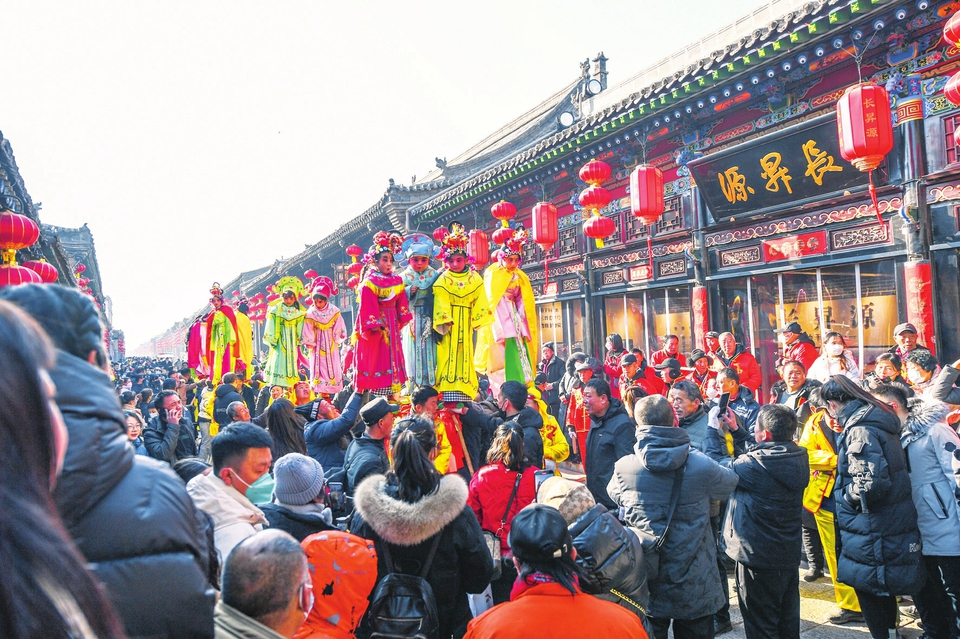 1月31日,游客在平遙古城觀(guān)看民俗社火表演。元宵節(jié)臨近,平遙古城內(nèi)舉行具有當(dāng)?shù)靥厣拿袼渍寡莼顒?dòng),熱熱鬧鬧迎元宵。