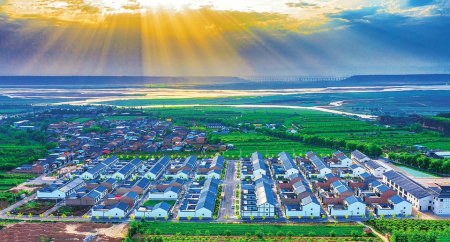 黃河萬(wàn)榮段河流與移民新村相映成畫。