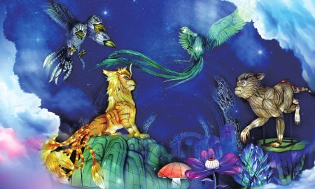 奇幻風格的桃花路上,《山海經(jīng)》中的仙山海景和祥瑞神獸也來助陣。渾身毛發(fā)雪白的九尾狐,三頭六尾名叫鵸的鳥妖、吼聲震天名叫狌狌的犲山獸、立于昆侖山巔遙望東方的陸吾、三首六尾夜半怪笑的鵸鵌、悠然自得的麋鹿、充滿神秘色彩的青鸞、抬腿準備騰云的飛馬……置身其中,仿佛斗轉(zhuǎn)星移,滄海桑田。地面的點點星光,營造出神秘夢幻的奇趣山海世界。