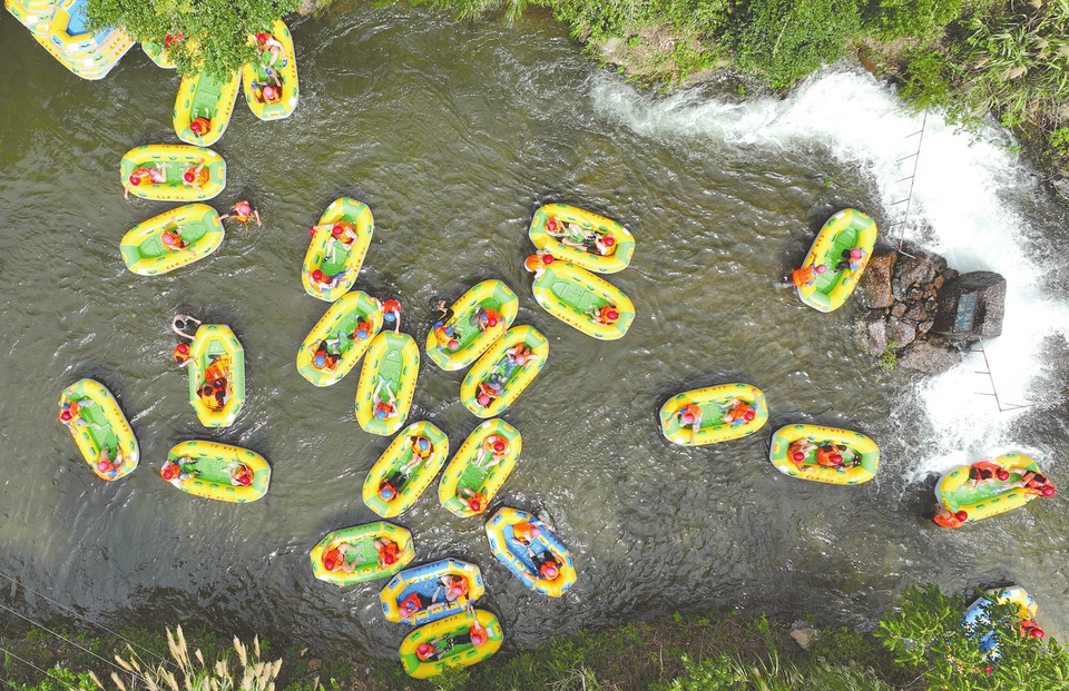 7月10日,湖南省衡陽市衡陽縣金蘭鎮(zhèn)聯(lián)龍村,游客在龍王峽漂流戲水(無人機照片)。連日來,多地持續(xù)高溫,眾多市民和游客選擇親水消暑,享受夏日清涼。