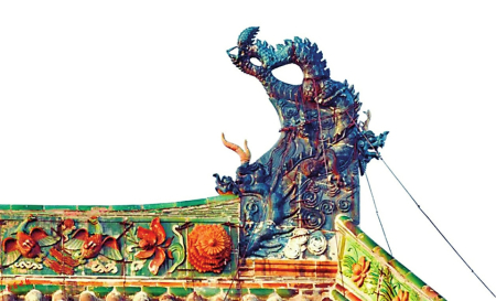 鴟吻又叫鴟尾,是中國(guó)古建筑上最常見(jiàn)的一種建筑構(gòu)件,一般用在古代建筑屋脊正脊兩端作為裝飾。山西永樂(lè)宮三清殿的鴟吻造型為龍首魚(yú)尾形象,龍頭寬口闊腮,怒目圓睜;腮旁龍牙粗壯強(qiáng)勁,造型夸張;龍身動(dòng)勢(shì)與鴟吻形狀相稱(chēng),龍尾處與后爪組成鏤空造型,環(huán)繞在四周的祥云紋和海波紋裝飾,賦予騰龍浮游海天之際的輕盈美,極具動(dòng)感。