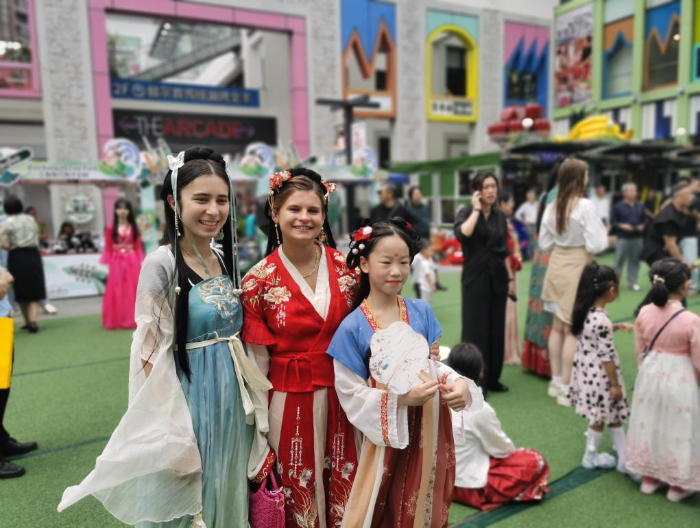 6月9日,身著中國古代服飾的外國人與中國兒童合影,參加非遺市集。新華社記者 陳愛平 攝