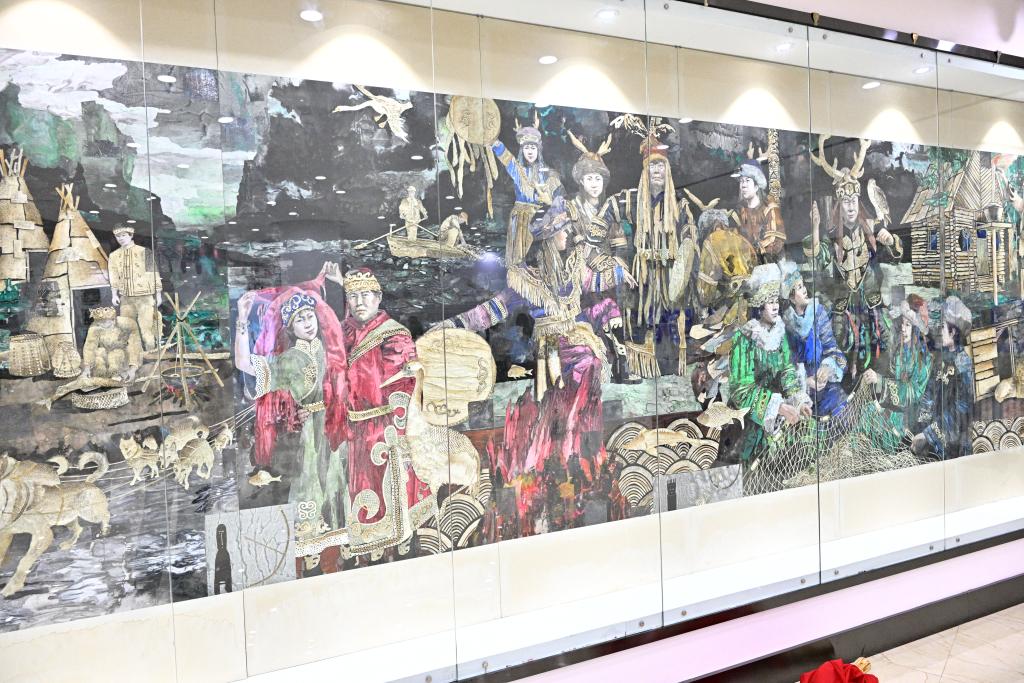 同江市非物質(zhì)文化遺產(chǎn)展示館中描繪赫哲族傳統(tǒng)生活的壁畫(huà)。新華社記者 丁赫 攝