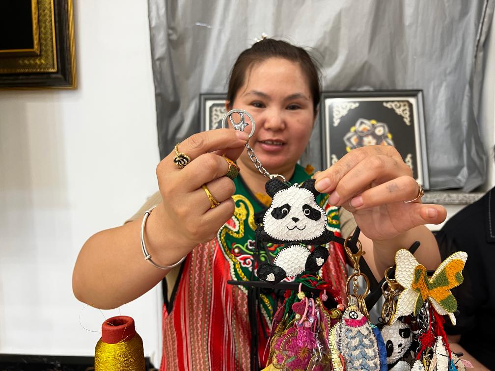 同江市非物質(zhì)文化遺產(chǎn)展示館內(nèi),赫哲魚(yú)皮匠人展示由她制作的大熊貓魚(yú)皮掛飾。新華社記者 楊軒 攝