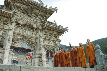 一次五臺(tái)山,五百年因緣。剛到龍泉寺108級(jí)臺(tái)階下,就聽到婉轉(zhuǎn)悠揚(yáng)又直入人心的樂曲聲從高處傳來。走到龍泉寺三寶之一的照壁抬眼向高望去,越過青石臺(tái)階,第二寶石牌坊下,一隊(duì)僧人正在演繹國(guó)家級(jí)非物質(zhì)文化遺產(chǎn)五臺(tái)山佛樂。