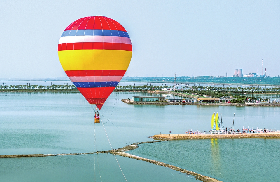 9月7日,游客在運(yùn)城鹽湖景區(qū)乘坐熱氣球觀賞鹽湖美景。近日,該景區(qū)推出“乘坐熱氣球 觀七彩鹽湖”體驗(yàn)游覽項(xiàng)目,讓游客感受別樣的鹽湖風(fēng)景。