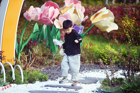 8.白石子、黑片石搭配打造的小路上,小朋友玩得不亦樂乎。