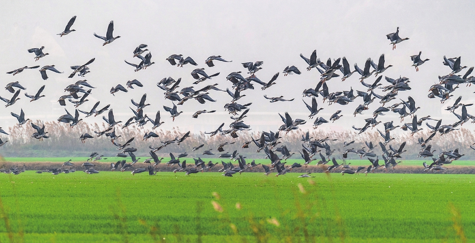 11月24日,國(guó)家二級(jí)保護(hù)動(dòng)物豆雁在臨猗縣黃河濕地飛翔,給冬季的濕地注入了生機(jī)與活力。近年來(lái),當(dāng)?shù)夭粩嗉哟簏S河流域生態(tài)保護(hù)力度,對(duì)野生鳥類開展“護(hù)飛行動(dòng)”,黃河濕地生態(tài)環(huán)境越來(lái)越好,來(lái)此越冬的鳥類數(shù)量和種類逐年增加。