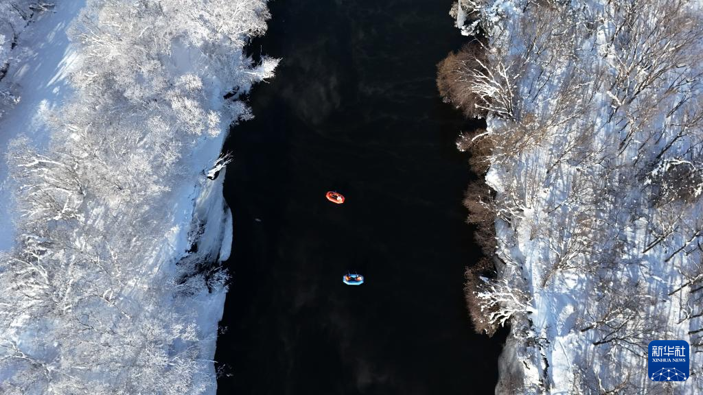 12月30日,在五大連池市山口湖景區(qū),游客體驗(yàn)漂流項(xiàng)目(無人機(jī)照片)。