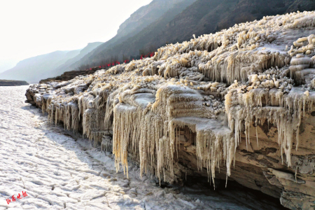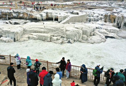 黃河壺口瀑布,往日奔騰咆哮的黃河水,像是被大自然施了魔法一般,飛濺的浪花和彌天水霧在兩岸巖石和護(hù)欄上迅速凝結(jié),形成了層層疊疊、形狀各異的冰掛。巨大的冰柱從河岸懸垂而下,宛如一座巨大的琉璃宮殿,又似一道天然的冰簾。河水拍打著冰層,發(fā)出震耳欲聾的咆哮聲,與飛瀑上空的彩虹交相輝映,展現(xiàn)出大自然的磅礴氣勢與壯美。