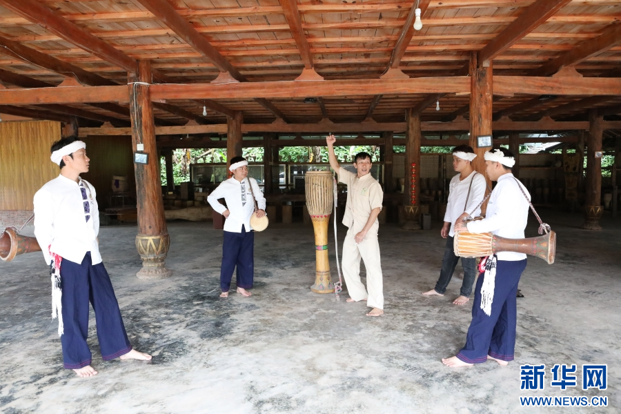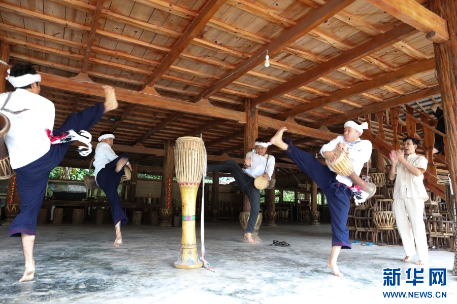 8月16日,波罕丙(右一)帶領徒弟練習象腳鼓舞。新華網(wǎng)發(fā)(李云生 攝)