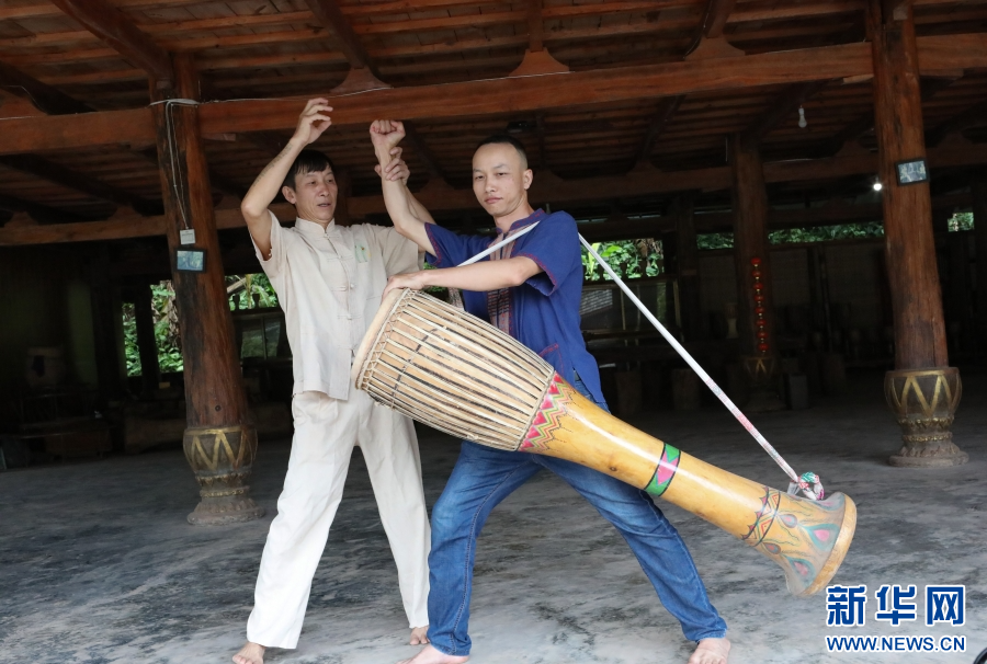 8月16日,波罕丙(左)為兒子巖罕丙講解象腳鼓舞要領。新華網(wǎng)發(fā)(李云生 攝)