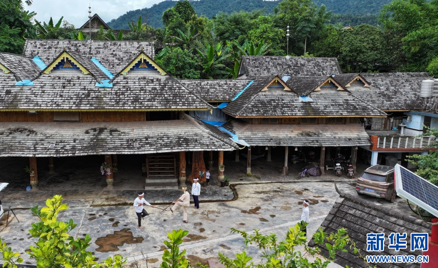 8月16日,波罕丙帶領徒弟們練習傣族武術(無人機照片)。新華網(wǎng)發(fā)(李云生 攝)