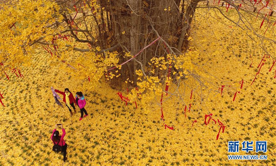 11月19日,游客在留壩縣玉皇廟鎮(zhèn)參觀千年銀杏樹。初冬時節(jié),在秦嶺深處的陜西省留壩縣玉皇廟鎮(zhèn)石窯壩村,一棵千年古銀杏樹的落葉宛如金色地毯,甚為壯觀。據當地林業(yè)部門介紹,該樹胸徑為4.45米,現有高度29米。新華社記者 陶明 攝