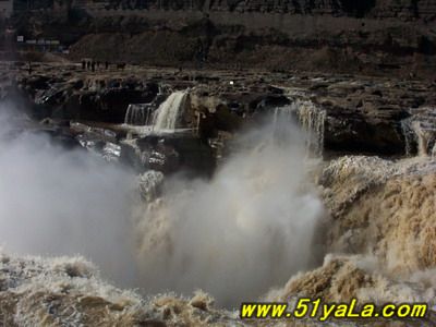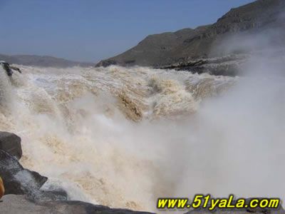 壺口瀑布位于吉縣城西45公里、距臨汾市165公里處的晉陜峽谷黃河河床中,為世界上最大的黃色瀑布,因其氣勢(shì)雄渾而享譽(yù)中外。此地兩岸夾山,河底石巖上沖刷成一巨溝,寬達(dá)30米,深約50米,滾滾黃水奔流至此,倒懸傾注,若奔馬直入河溝,波浪翻滾,驚濤怒吼,震聲數(shù)里可聞。其形如巨壺沸騰,故名。黃河浪濤激起一團(tuán)團(tuán)霧煙云隨著水霧的升高,煙云由黃變灰、由灰變藍(lán),景色奇麗,有“水底生煙”之說(shuō)。壺口瀑布不僅有“水底冒煙”,“彩橋通天”奇景,更有“旱地行船”之說(shuō)。上游船只到此,必須離水登陸,經(jīng)人抬或車(chē)運(yùn)繞過(guò)壺口(即所謂“旱地行船”)方可入水續(xù)航,千百年來(lái),概莫能變。