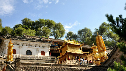 顯通寺的大雄寶殿為舉行佛事活動(dòng)主要場(chǎng)所,是顯通寺的第三重大殿,殿內(nèi)供著三尊佛像:中是釋迦牟尼佛,西是阿彌陀佛,東是藥師佛;兩旁有十八羅漢像背后有觀音、文殊、普賢三尊菩薩像。觀音殿殿內(nèi),中間供著觀音菩薩像,左右供著文殊和普賢菩薩像。大文殊殿,是顯通寺的第二重大殿。大文殊殿內(nèi),供著七尊文殊菩薩像:正中的為大智文殊;前面的五位,從左至右,依次為西臺(tái)獅子文殊,南臺(tái)智慧文殊,中臺(tái)孺者文殊,北臺(tái)無垢文殊,東臺(tái)聰明文殊;大智文殊后面是甘露文殊。文殊像前有護(hù)法神韋馱像,兩側(cè)有十八羅漢像。