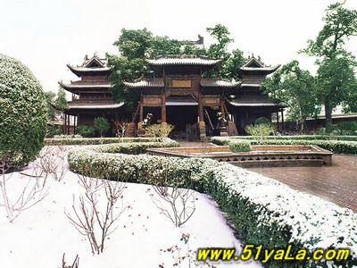 前行有午門(mén).是一座面闊五間,單檐廡殿頂、石雕回廊的廳式建筑。周?chē)惺瘷跅U,欄板正反兩面浮雕各類(lèi)圖案、人物144幅,洋洋大觀,頗有童趣。廳內(nèi)南有周倉(cāng)、廖化畫(huà)像,軒昂威武。北面左右兩側(cè),彩繪著關(guān)羽戎馬一生的主要經(jīng)歷,起于桃園三結(jié)義,止于水淹七軍,只是沒(méi)有走麥城這個(gè)情節(jié),在全國(guó)關(guān)廟壁畫(huà)中都按此進(jìn)行,據(jù)說(shuō)這是因忌諱關(guān)羽自高自大而被殺,終于造成蜀國(guó)的覆滅而隱去的。穿過(guò)午門(mén),經(jīng)“山海鐘靈”坊、御書(shū)樓,便是關(guān)帝廟主體建筑崇寧殿。