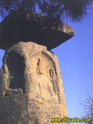 主峰極頂列為首區(qū),有石塔兩座,佛龕一區(qū),龕為三塊巨石疊成,下為臥羊,中為佛龕,上為瓦隴式屋頂,龕內(nèi)內(nèi)置一佛二菩薩,佛像結(jié)跏而坐,面型衣飾皆屬北魏風格。