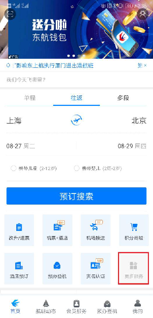 1.打開(kāi)東方航空最新版APP,在【首頁(yè)】選擇【更多服務(wù)】