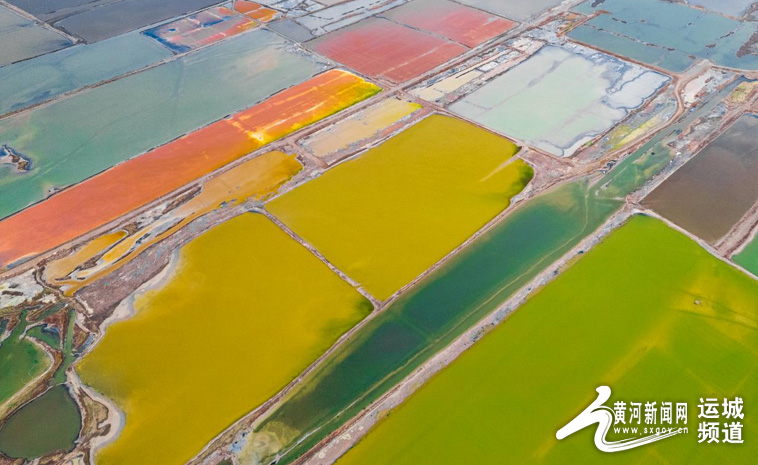 4月14日無人機(jī)拍攝的山西運城鹽湖。近日,隨著氣溫不斷升高,山西運城鹽湖呈現(xiàn)五彩斑斕的景象,美不勝收。