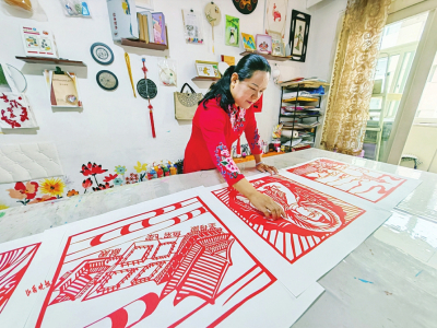 8月31日上午9時許,正值周末假期,位于太原市迎澤區(qū)的一處安靜的老式單元樓內(nèi),太原市非遺任氏民俗剪紙的第四代傳承人任麗紅,正在自己的工作室,認(rèn)真而忘我地研究著山西古建的基本結(jié)構(gòu)與建筑風(fēng)格。而在她的旁邊,則放著早已準(zhǔn)備好的刻刀、大紅宣紙、小剪刀、各色養(yǎng)料、毛筆等制作剪紙所需的工具和材料。