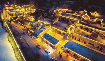 2月15日,太原市店頭村,明亮的“燈帶”勾勒出古村落輪廓,如墜夢境,別有韻味,吸引了游客前來打卡。