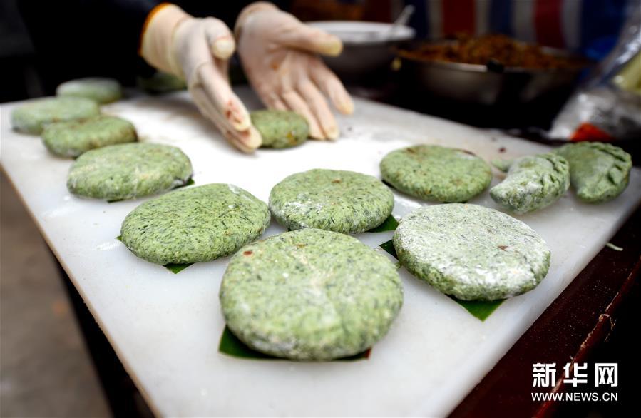 4月2日,黃山市徽州區(qū)西溪南村村民在制作清明粿。清明將至,安徽省黃山市徽州區(qū)的農(nóng)家忙著制作清明粿。清明粿是當(dāng)?shù)厍迕鲿r(shí)節(jié)的特色小吃,將新鮮艾草汁拌入糯米粉,再填入徽州特色風(fēng)味的火腿肉、筍丁、肉絲蘿卜丁等原料做成的餡,捏合成清明粿,蒸熟即可食用。新華社發(fā)(周牧 攝)