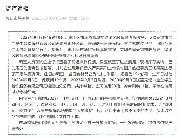9月9日,無錫市惠山區(qū)市場監(jiān)管局發(fā)布調(diào)查通報稱,不存在使用過期食材行為,網(wǎng)傳過期照片為員工圖方便搜索以前存在電腦中的牛柳圖片文件并上傳。