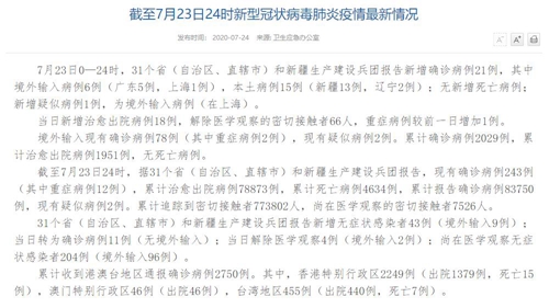 情況表示,截至7月23日24時,據(jù)31個省(自治區(qū)、直轄市)和新疆生產(chǎn)建設(shè)兵團(tuán)報(bào)告,現(xiàn)有確診病例243例(其中重癥病例12例),累計(jì)治愈出院病例78873例,累計(jì)死亡病例4634例,累計(jì)報(bào)告確診病例83750例,現(xiàn)有疑似病例2例。累計(jì)追蹤到密切接觸者773802人,尚在醫(yī)學(xué)觀察的密切接觸者7526人。