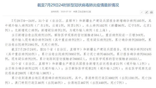 人民網(wǎng)北京7月30日電(董童)國家衛(wèi)生健康委于今日在官網(wǎng)發(fā)布的《截至7月29日24時新型冠狀病毒肺炎疫情最新情況》(以下簡稱“情況”)提出,7月29日0—24時,31個?。ㄗ灾螀^(qū)、直轄市)和新疆生產(chǎn)建設(shè)兵團報告新增確診病例105例,其中境外輸入病例3例(廣東1例,云南1例,陜西1例),本土病例102例(新疆96例,遼寧5例,北京1例);無新增死亡病例;新增疑似病例1例,為境外輸入病例(在上海)。當(dāng)日新增治愈出院病例13例,解除醫(yī)學(xué)觀察的密切接觸者584人,重癥病例較前一日增加8例。