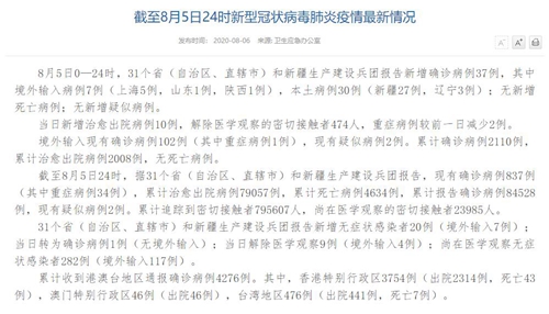 人民網(wǎng)北京8月6日電(董童)國(guó)家衛(wèi)生健康委于今日在官網(wǎng)發(fā)布的《截至8月5日24時(shí)新型冠狀病毒肺炎疫情最新情況》(以下簡(jiǎn)稱(chēng)“情況”)提出,8月5日0—24時(shí),31個(gè)?。ㄗ灾螀^(qū)、直轄市)和新疆生產(chǎn)建設(shè)兵團(tuán)報(bào)告新增確診病例37例,其中境外輸入病例7例(上海5例,山東1例,陜西1例),本土病例30例(新疆27例,遼寧3例);無(wú)新增死亡病例;無(wú)新增疑似病例。當(dāng)日新增治愈出院病例10例,解除醫(yī)學(xué)觀察的密切接觸者474人,重癥病例較前一日減少2例。